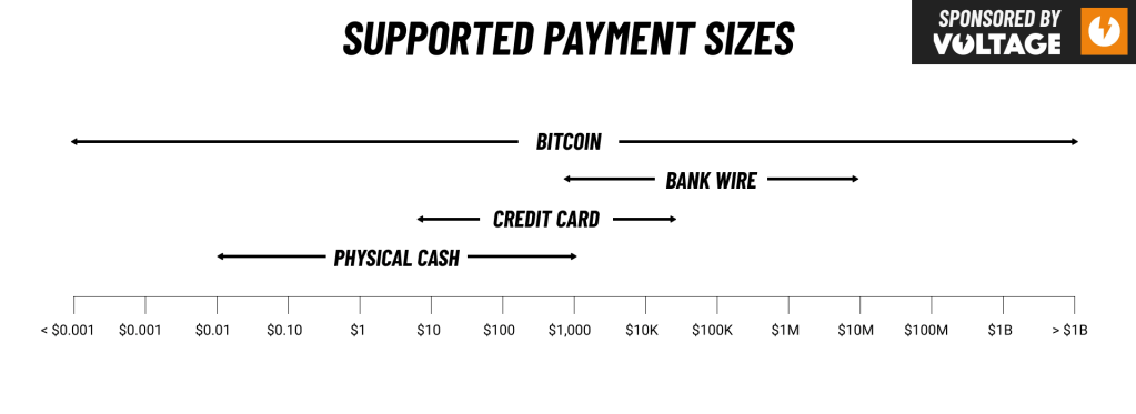 Grundsätzlich kennt das Bankensystem keine Maximal-Beträge. Jedoch setzen Banken individuelle Regeln auf Basis der Compliance-Regelungen. Mikro-Transaktionen sind aufgrund der Fixkosten nicht realisierbar. Lightning im Zusammenspiel mit der Blockchain erlaubt die ökonomisch sinnvolle Abwicklung aller Betragshöhen – von Promillen eines Rappen bis zu Milliarden-Beträgen.